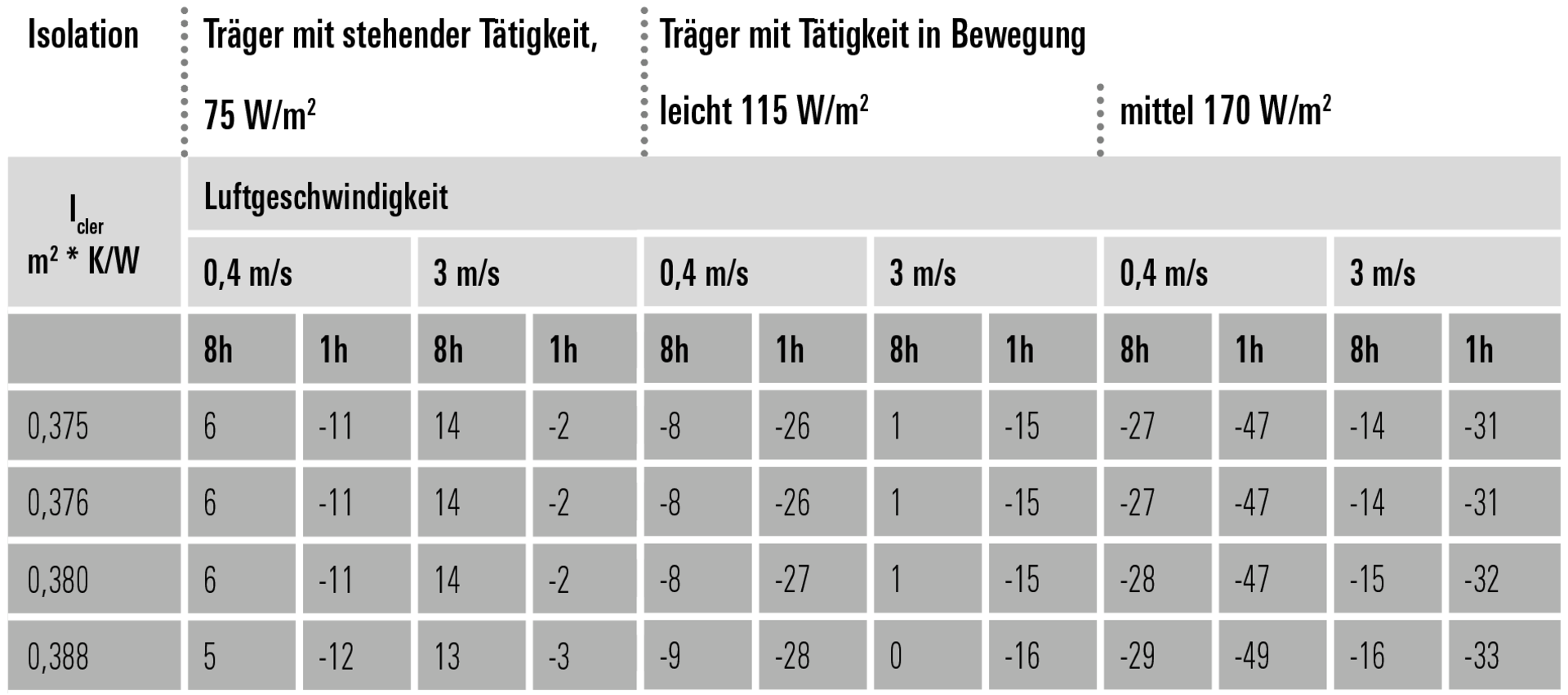 Auskunft über den Grad der Schutzwirkung gibt die Tabelle. Grundsätzlich gilt: Je höher der Wert der Isolation, desto länger der Schutz vor Kälte. Ein Beispiel für einen Träger mit stehender Tätigkeit: Ein Artikel mit dem Isolationswert 0,47 schützt eine Stunde lang vor Temperaturen bis zu -20° C und acht Stunden lang vor Temperaturen bis zu 0° C. Den jeweiligen Isolationswert finden Sie auf den Produktseiten.