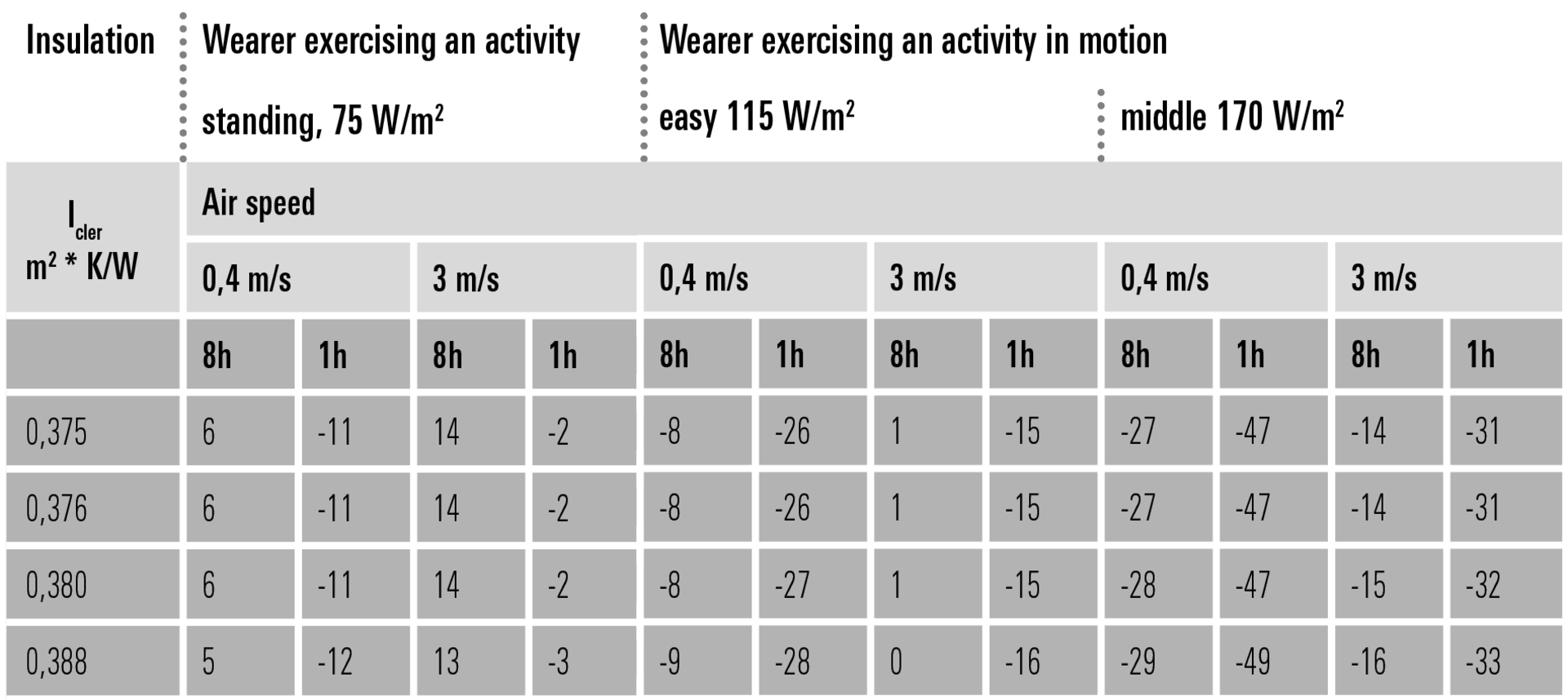 The table provides information on the degree of protection. Basically: The higher the value of the insulation, the longer the protection against the cold. An example of a wearer carrying out a standing activity: An item with an insulation value of 0.47 protects against temperatures as low as -20°C for one hour and against temperatures as low as 0°C for eight hours. You will find the respective insulation value on the product pages.