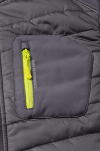 - Left chest pocket with yellow zip and reflective appliqué