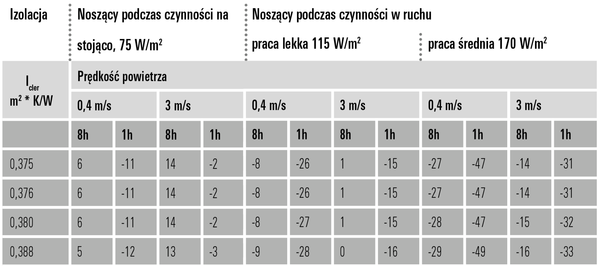 Tabela zawiera informacje o stopniu ochrony. Obowiązuje następująca zasada: Im wyższy stopień izolacji, tym dłuższa ochrona przed zimnem. Przykład użytkownika wykonującego pracę w pozycji stojącej: Produkt o wartości izolacyjnej 0,47 chroni przed temperaturami do -20°C przez godzinę i przed temperaturami do 0°C przez osiem godzin. Dana wartość izolacyjna znajduje się na stronie z produktami.